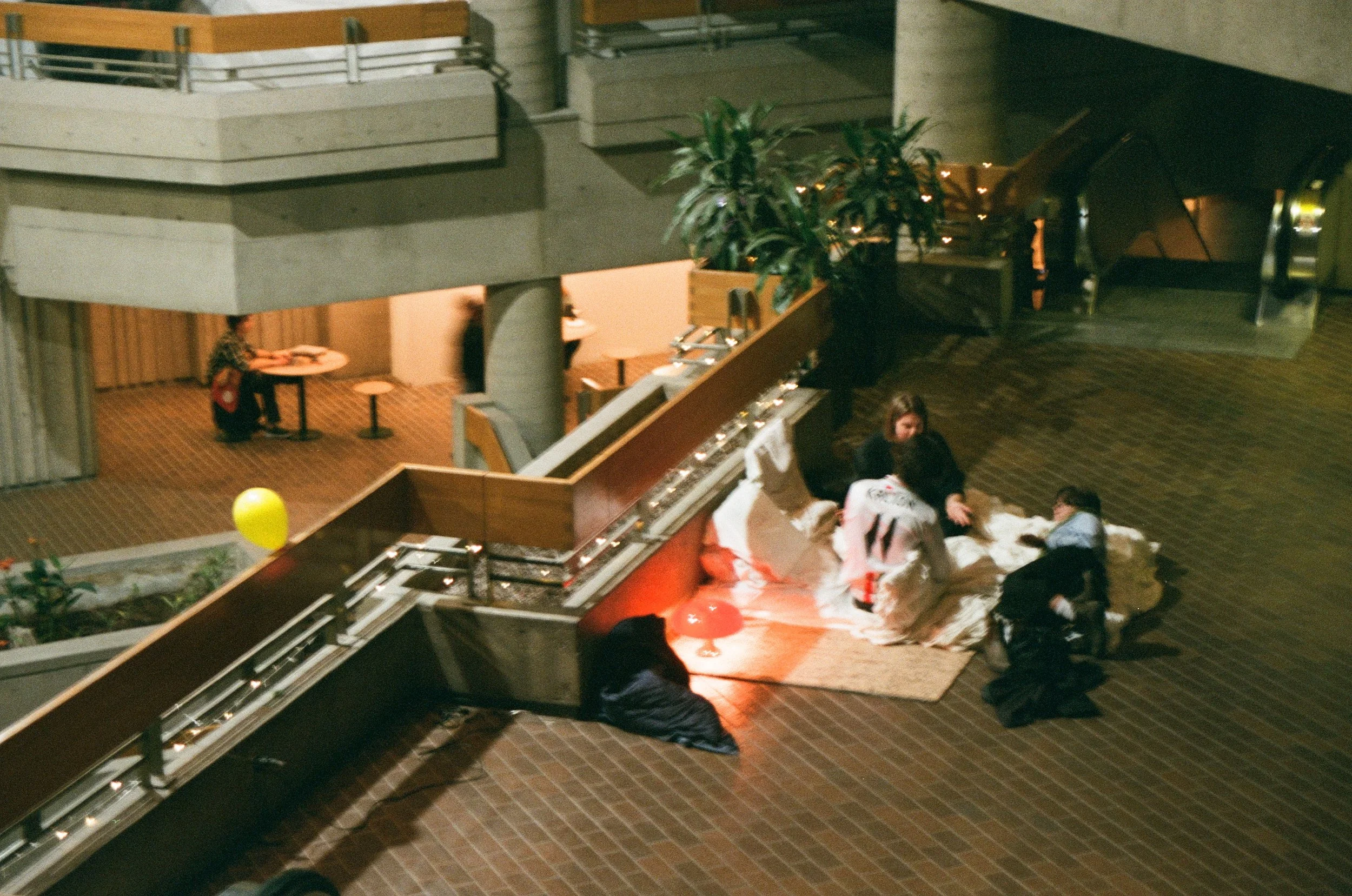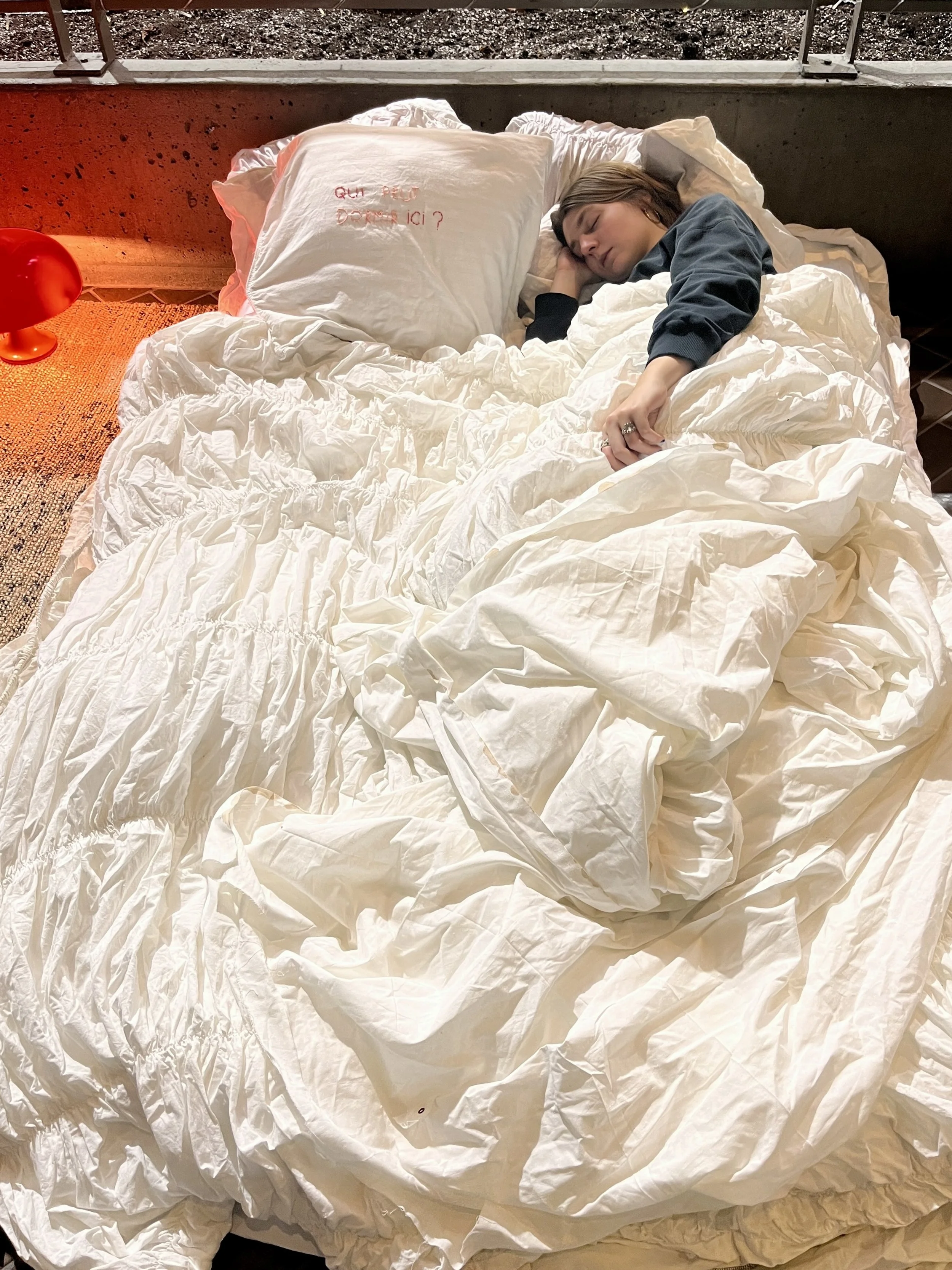Veillé.e est une performance in situ où un lit est installé dans un espace public institutionnel. Sur un coussin, la question brodée « Qui peut dormir ici ? » invite à réfléchir à la valeur du repos, aux privilèges et à la tendresse.